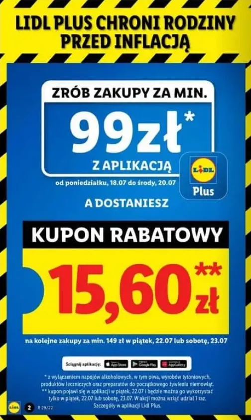 Акція починає діяти уже відсьогодні, 18 липня, і триватиме лише до середи 20 липня. Щоб отримати ваучер на 15,60 злотих, необхідно потратити у Lidl мінімум 99 злотих і використати при покупці додаток Lidl Plus.