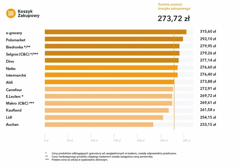 За даними дослідження "Shopping Basket Research and Report" агентства ASM Sales Force, покупки в січні 2023 року порівняно з початком минулого року були дорожчими в середньому на 15%. При цьому середня вартість продуктового кошика у Biedronka склала майже 280 злотих, в той час, як в Auchan – 233,15 злотих.