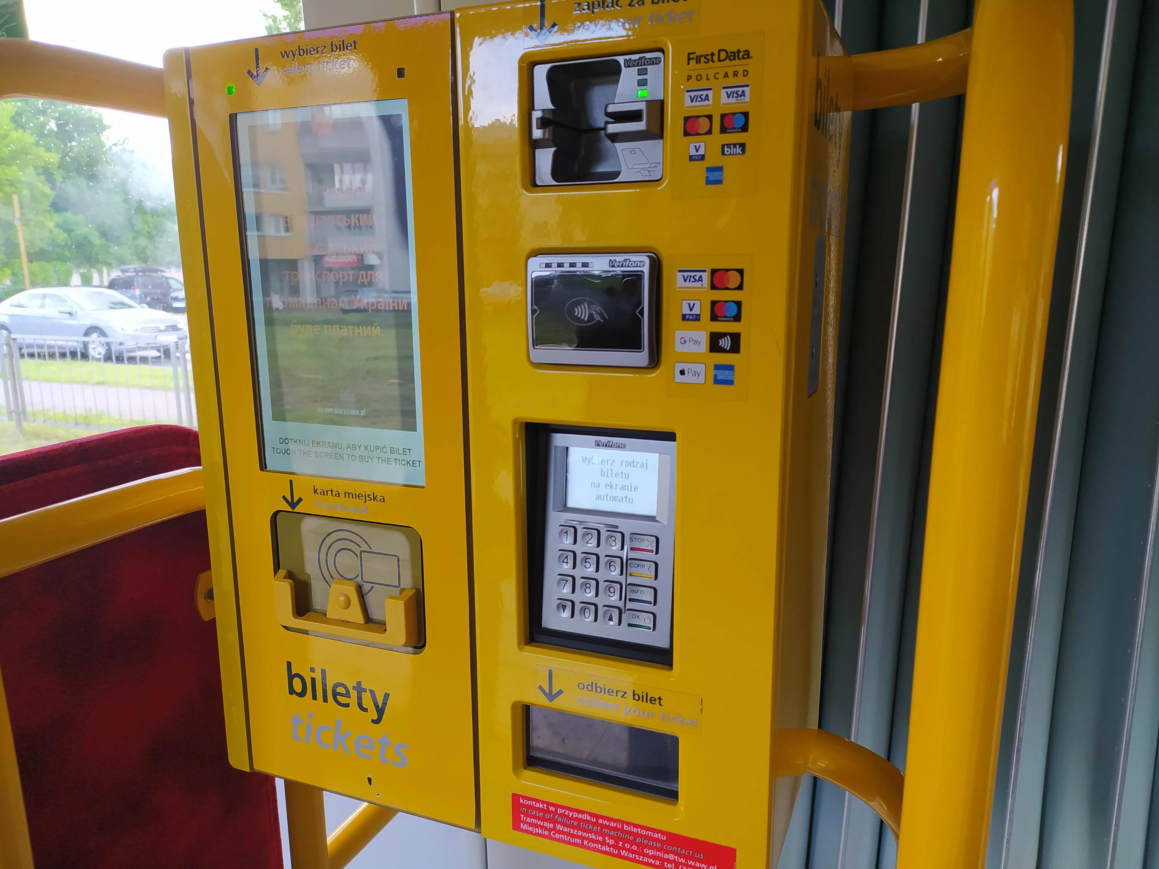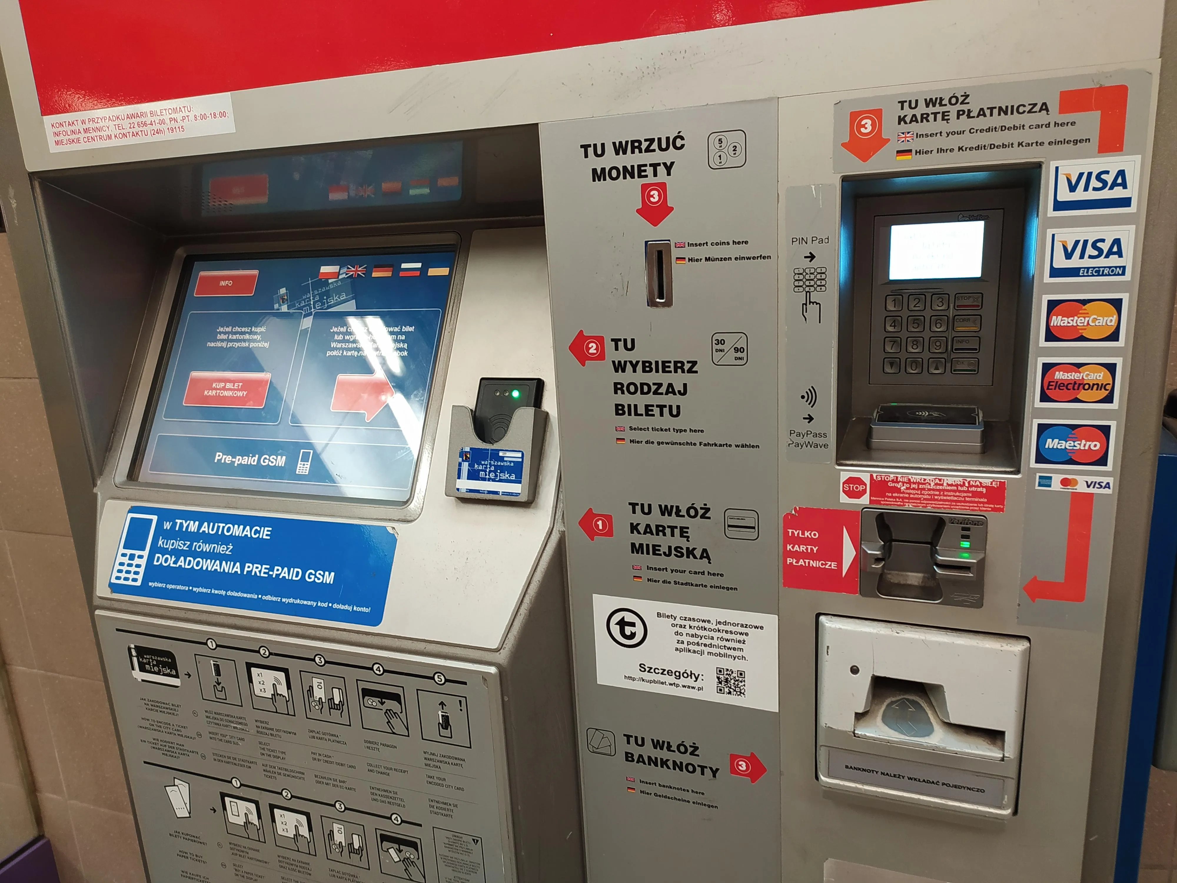 Сплатити можна банківською карткою, в деяких автоматах готівкою та за допомогою BLIK. У квиткоматах доступні російська та українська мови.