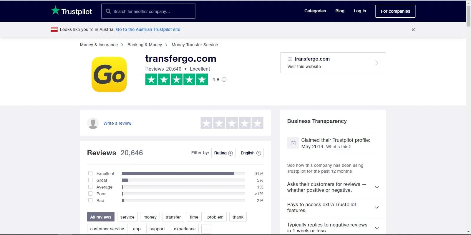 Напрацювавши величезну базу клієнтів по всьому світу, про якість сервісу TransferGo говорить його репутація. На платформі Trustpilot компанія отримала рейтинг 4,8 на основі понад 20 тисяч відгуків користувачів.