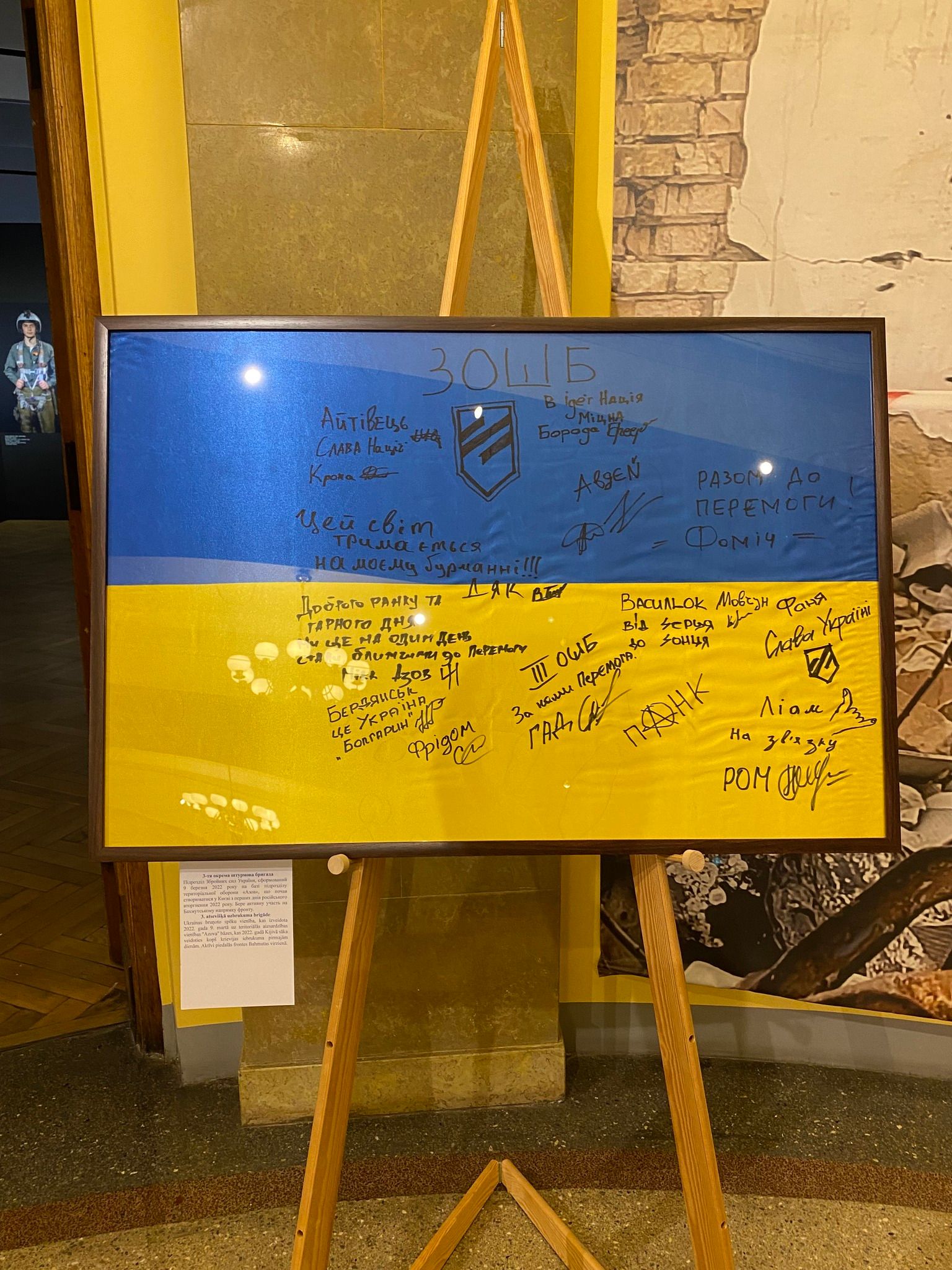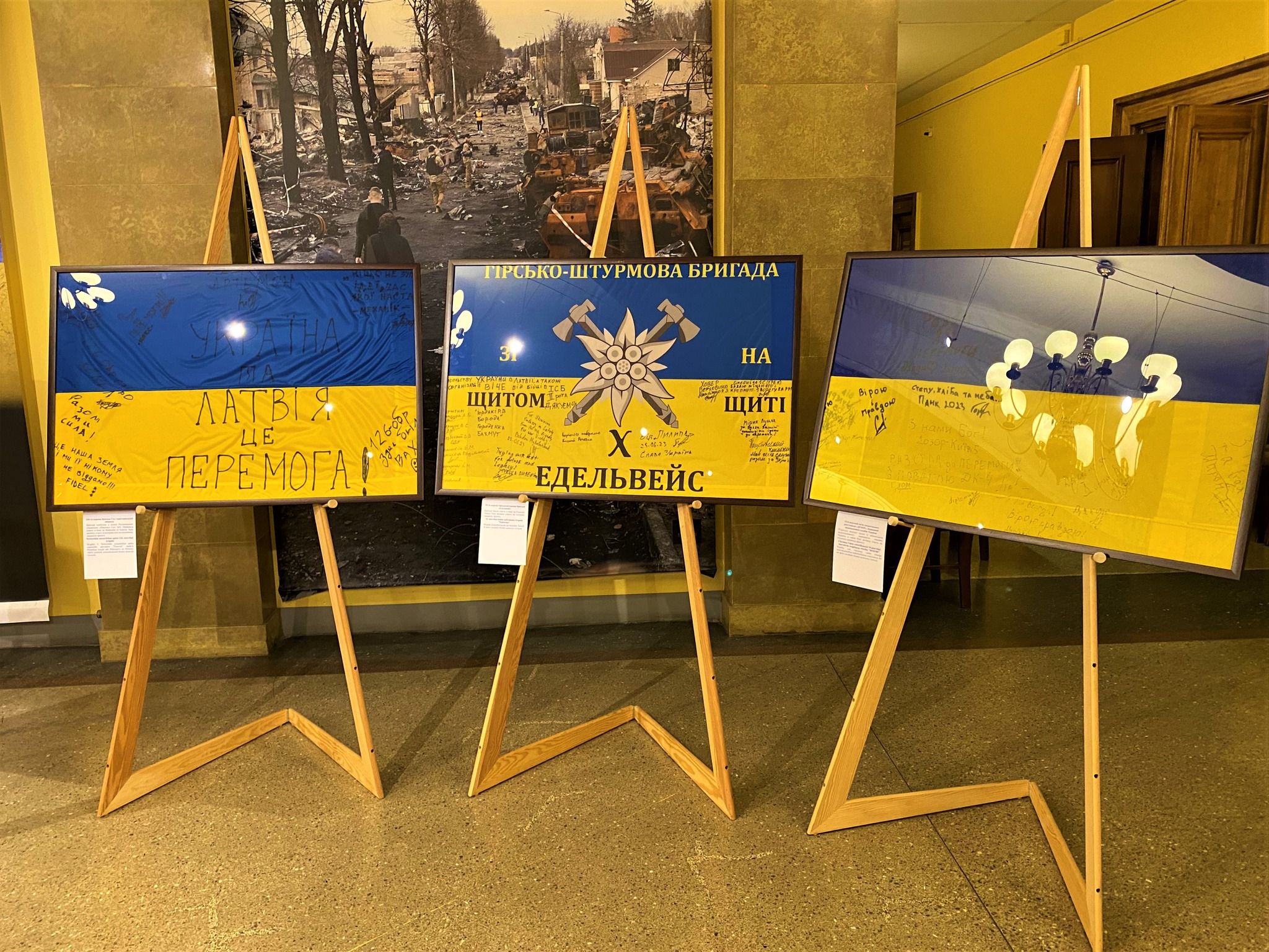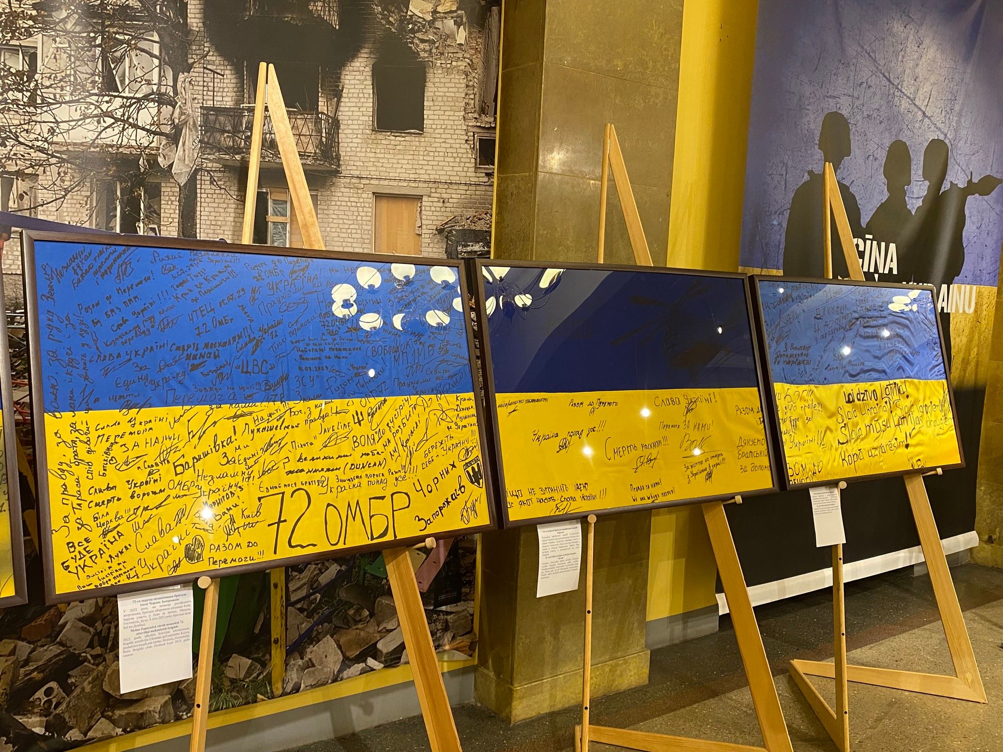 На виставці представлено 23 прапори, які підписали українські військові різних підрозділів: