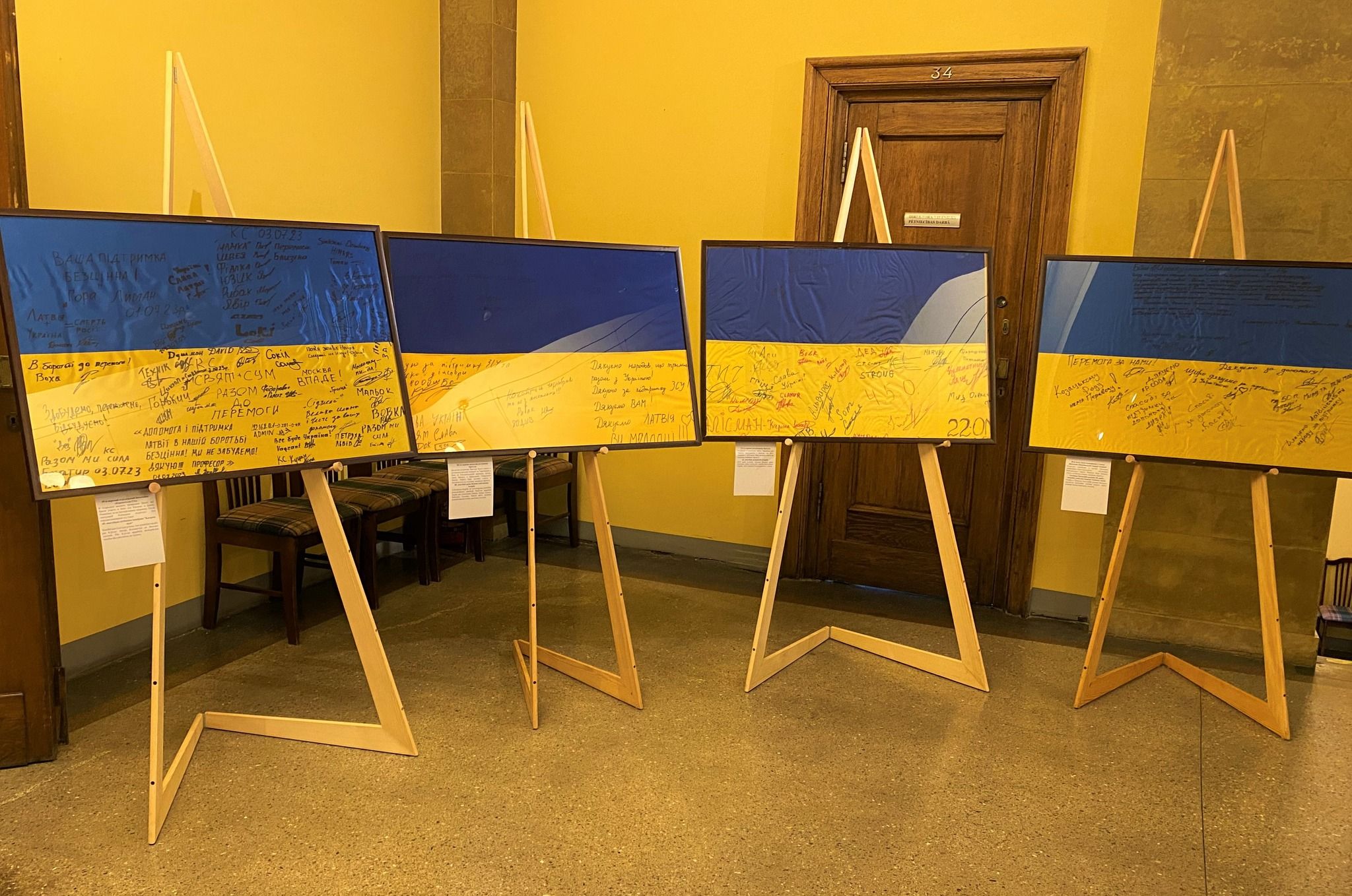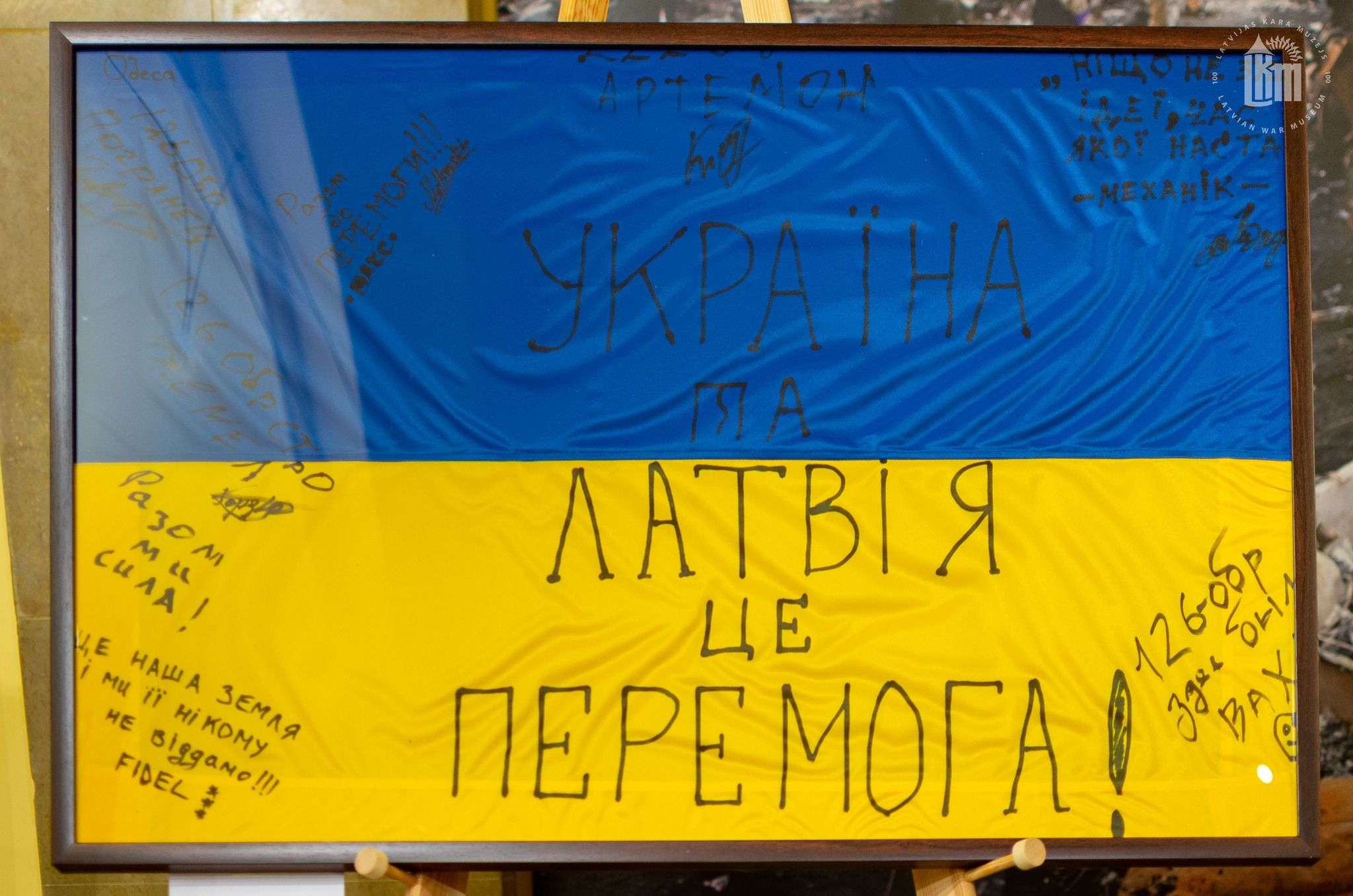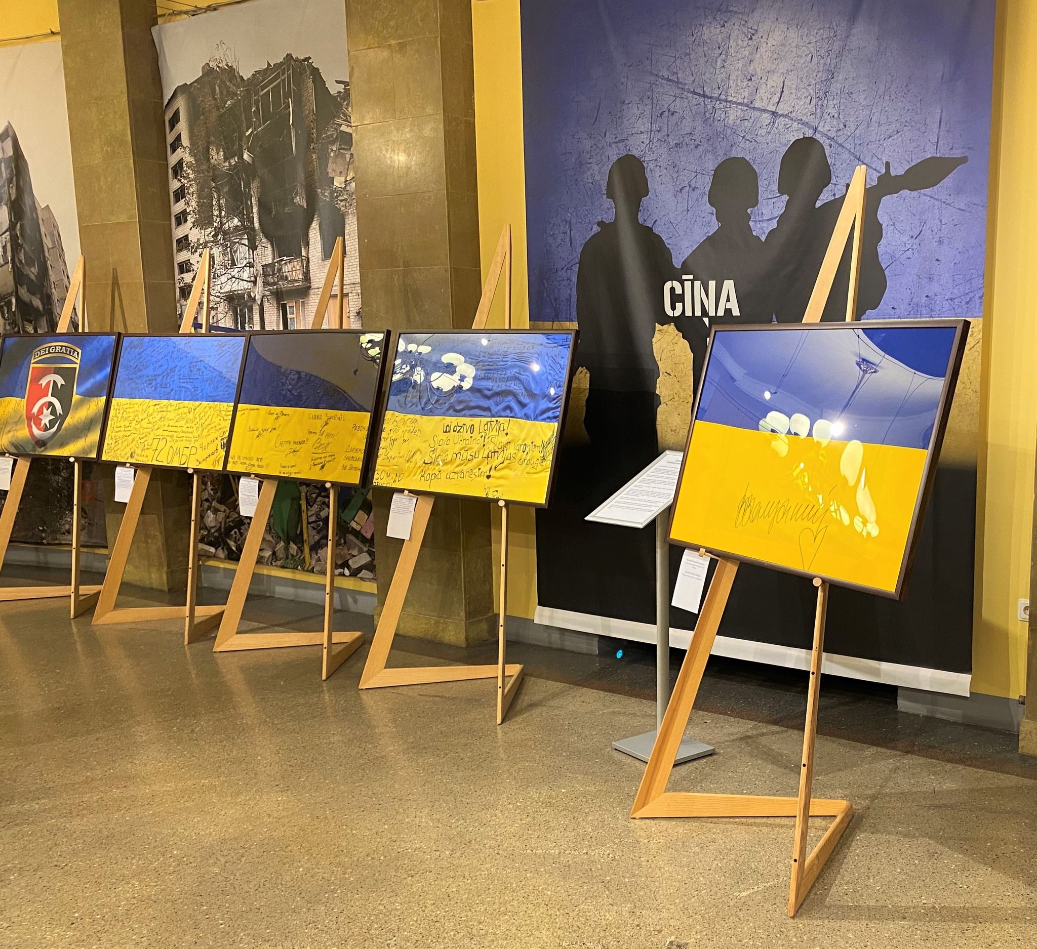 На виставці представлено 23 прапори, які підписали українські військові різних підрозділів: