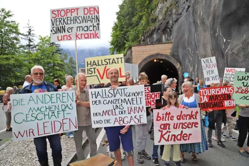 Австрійцям набридли натовпи туристів, тому вони зібралися на акцію протесту. Місцеві жителі вимагали обмежити кількість мандрівників та заборонити екскурсійні автобуси після 17:00.