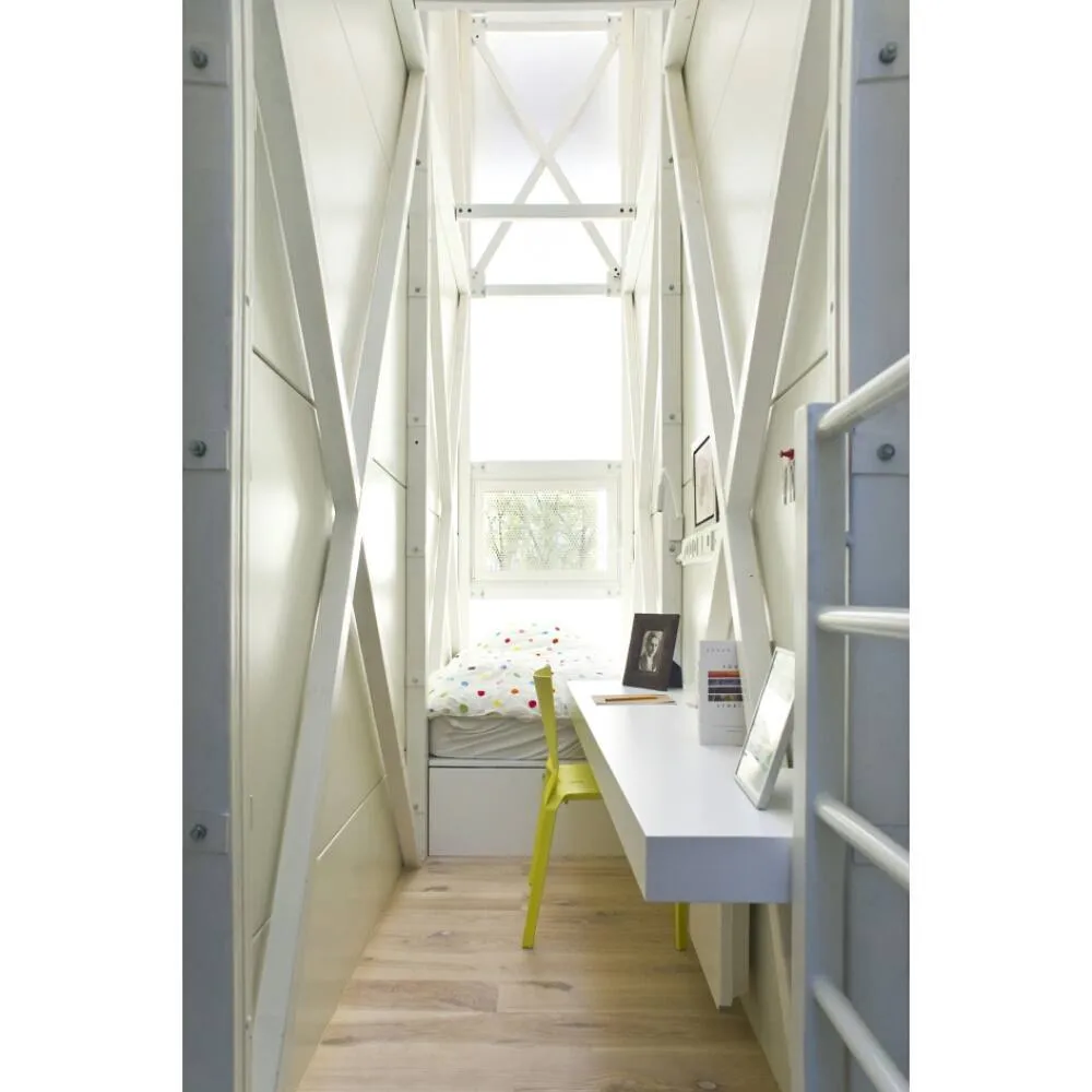Його звели у 2012 році між довоєнним житловим будинком та повоєнним кооперативом. На двох поверхах облаштували кухню, вітальню, ванну кімнату з душем та спальню. Денне світло у приміщення потрапляє через перфорований фасад.