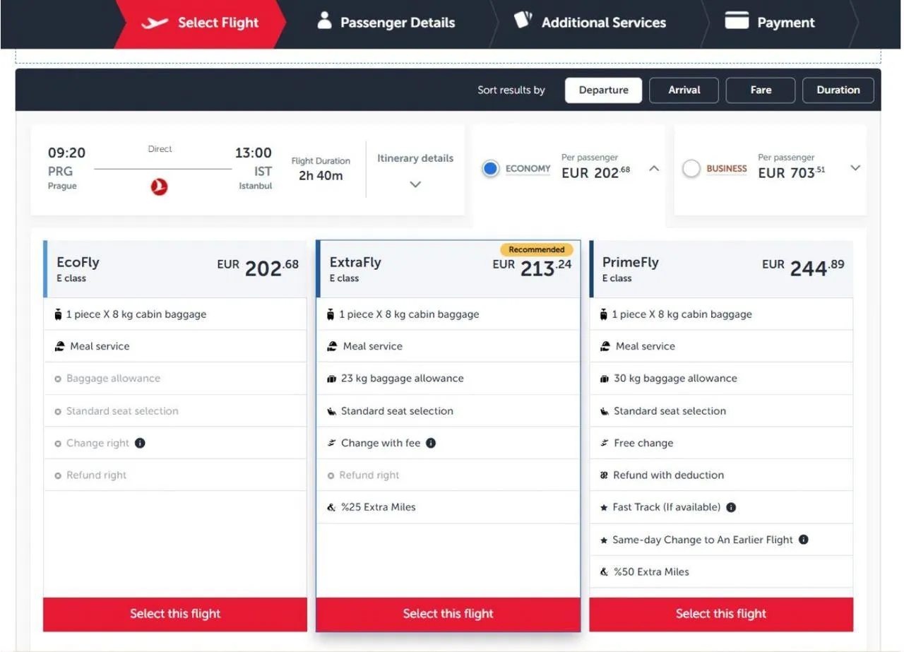 Приклад нових тарифів економкласу Turkish Airlines на рейсах середньої дальності / Скриншот із сайту авіакомпанії