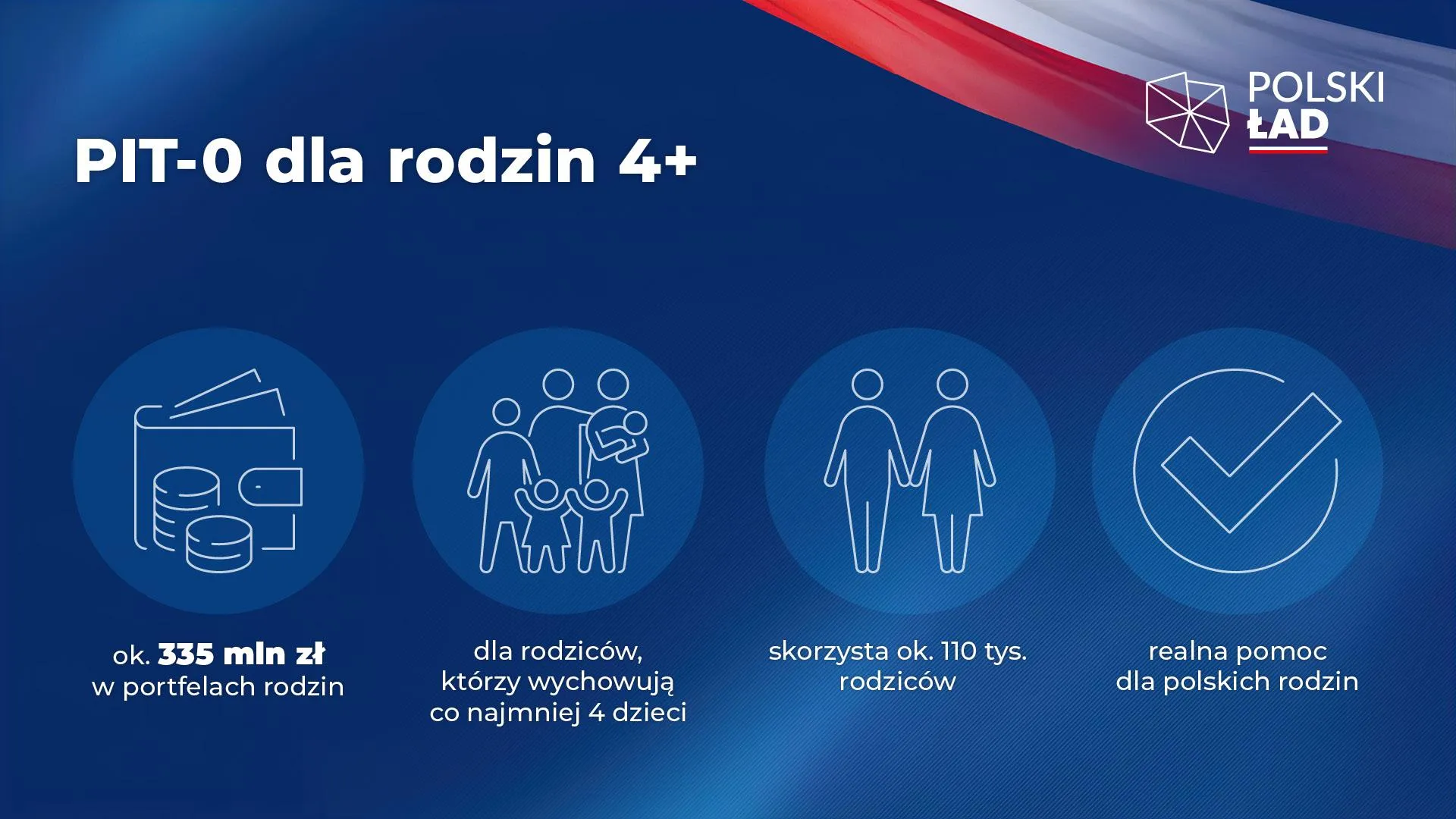 Тепер у рамках "Польського ладу" уряд Польщі запроваджує PIT-0 (нульову податкову ставку) для сімей, які виховують від 4 дітей. Завдяки цьому переважна більшість багатодітних батьків отримають право не платити ПДФО.