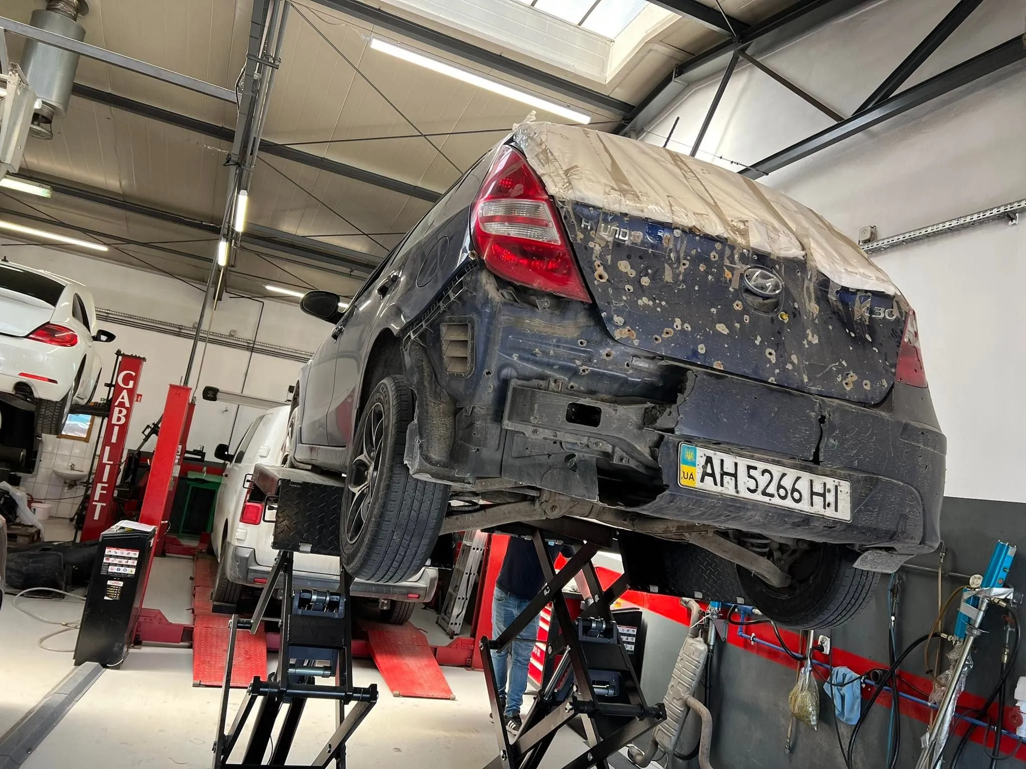 Тепер обстріляний Hyundai перебуває на одному з СТО мережі, де його ремонтують безкоштовно. Нагадаємо, що попередньо власник машини повідомляв про пробитий бензобак та пошкоджену проводку. Крім цього, значного ремонту чекає й сам кузов, який пробили уламки російських ракет та бомб.
