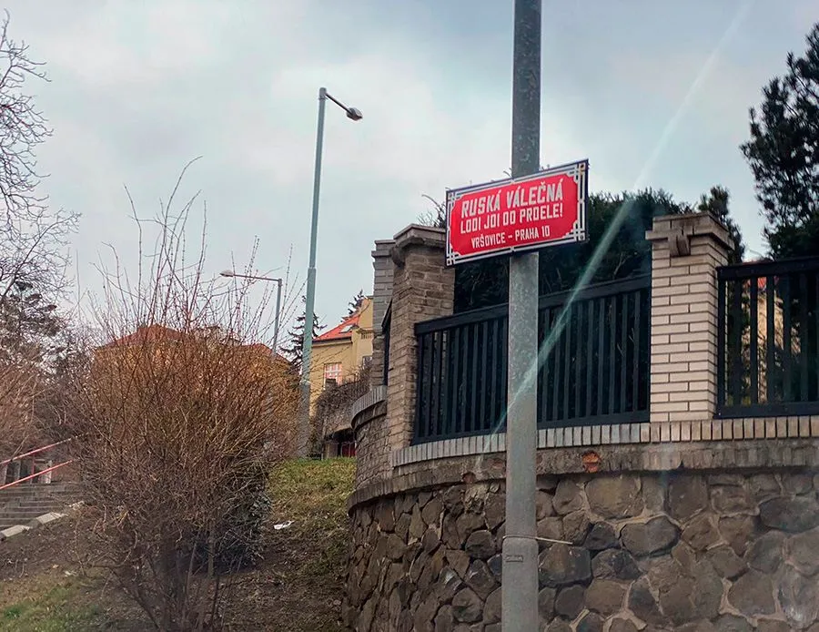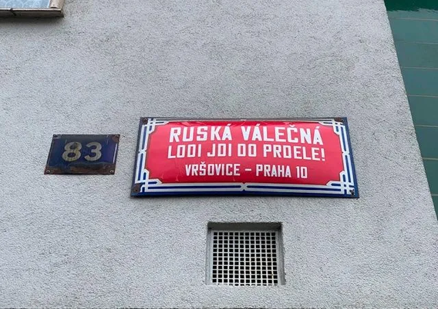 Йдеться про вулицю Ruská, що розташована в районі Вршовіце. Усі навігаційні таблички з цією назвою заклеїли уже відомим на весь світ посланням російському кораблю. Про це написала журналістка Ірина Ромалійська на своїй сторінці у фейсбуку.