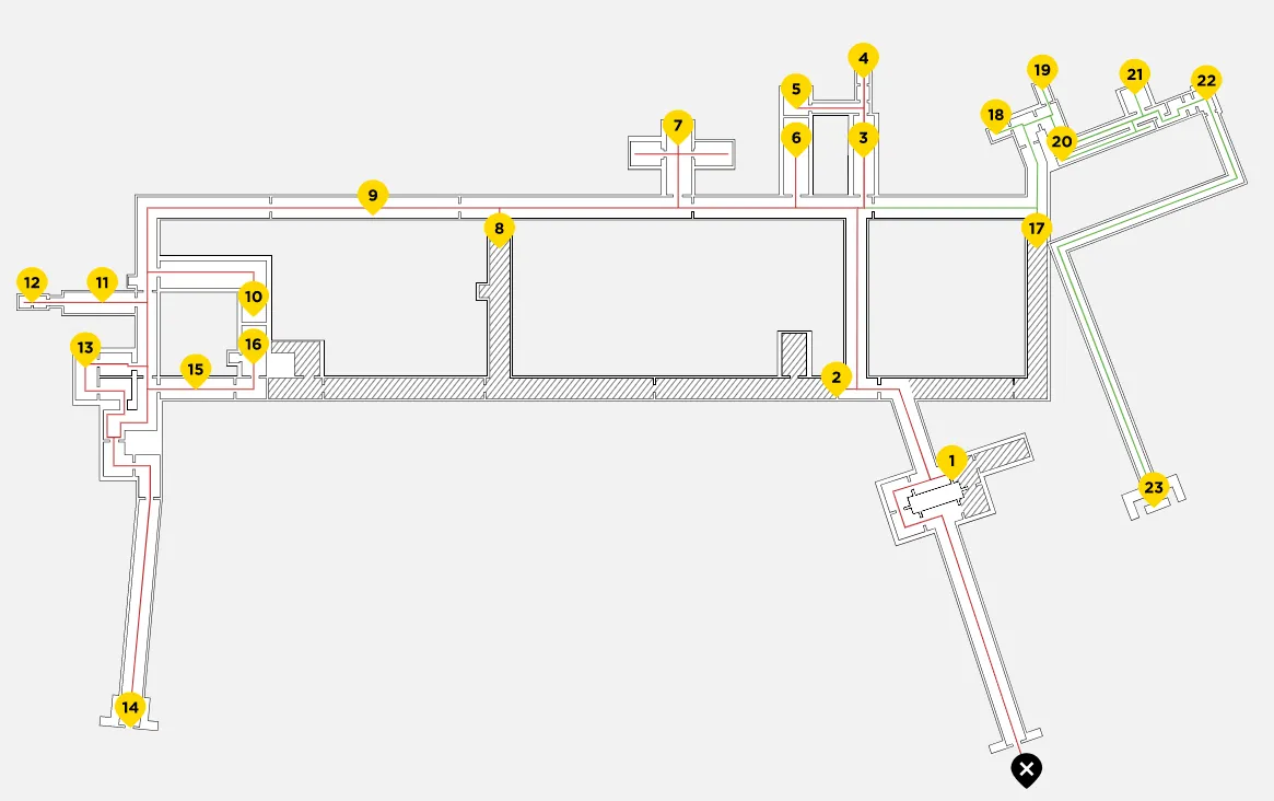 Екскурсія розділена на два основних кола. Дивіться нижче план (заштриховані ділянки недоступні для громадськості):