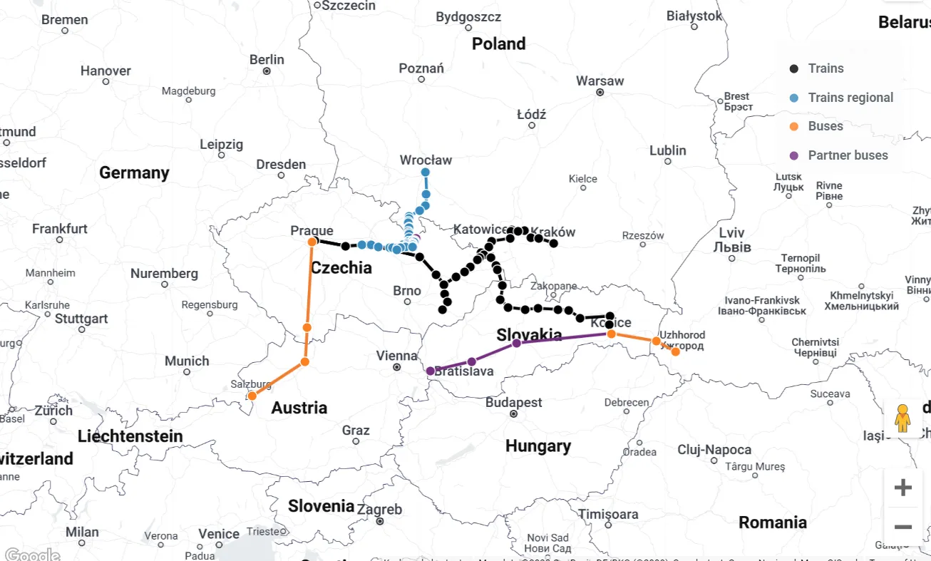 Так, чешский перевозчик выполняет рейсы из Ужгорода и Мукачево в Кошице в Словакии. В свою очередь, пассажиры могут в Кошице осуществить пересадку на другие поезда или автобусы в Европу. Также доступны рейсы в Польше, Словакии, Чехии и Австрии!