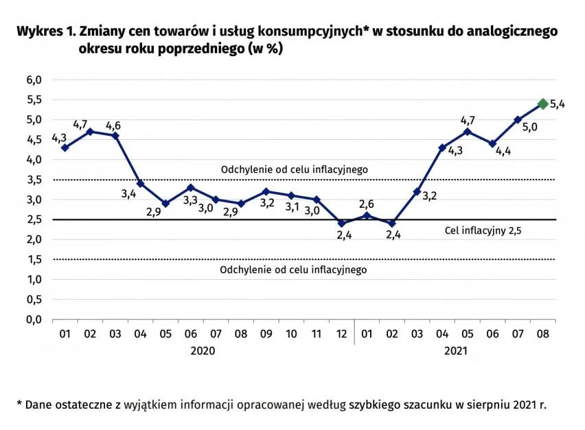 В июле 2021 года в республике фиксировали наибольший уровень роста инфляции за последнее десятилетие. Тогда показатель составил 5%, а в августе – почти на пол процента выше. Сейчас уровень инфляции в Польше превышает все показатели последних 20 лет.