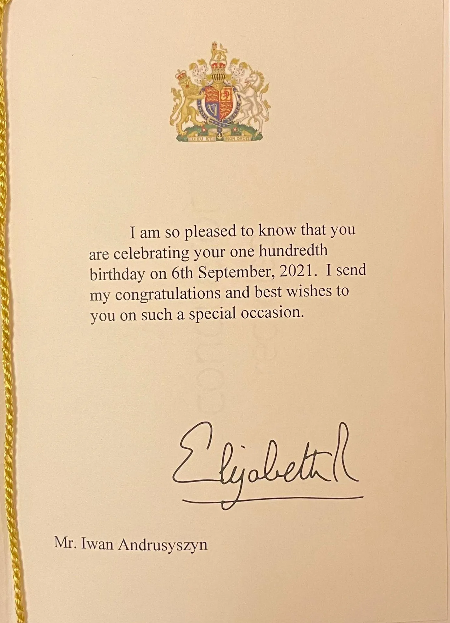 Иван Андрусишин праздновал 100-летие 6 сентября 2021 года. Фото письма с поздравлением от королевы опубликовало Посольство Украины в Великобритании на своей странице в фейсбук.