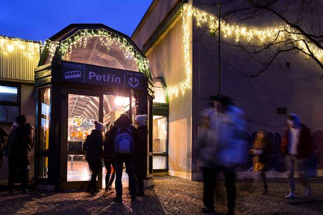 Кроме того, коммунальщики празднично украсили фуникулер на холме Петршин.