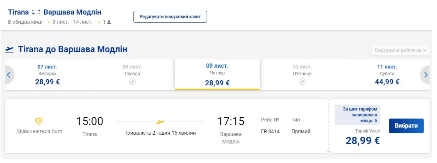 Пример бронирования билетов Тирана – Варшава / Скриншот с сайта Ryanair