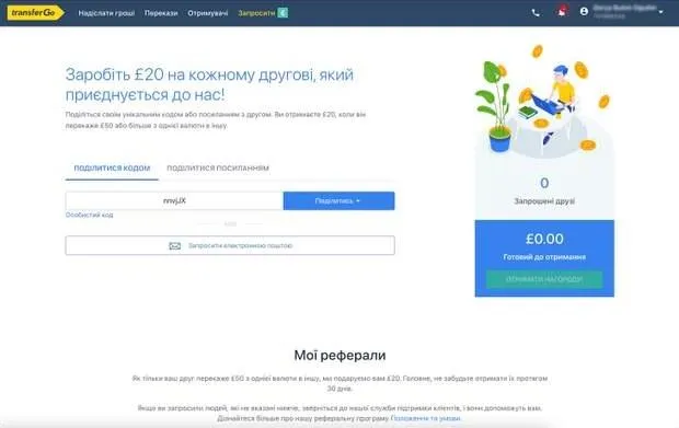 Зарабатывать с TransferGo – просто. Компания предлагает клиентам возможность получать бонусы за переводы друзей. В личном кабинете пользователи могут найти уникальный реферальный код, с помощью которого удастся накапливать реальные деньги на счет. Итак, чтобы получить свое вознаграждение, следует сделать следующие шаги: