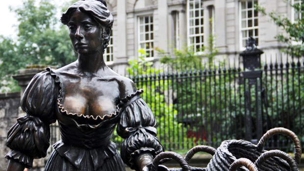 Бронзовый памятник Молли Мэлоун появился в честь празднования первого тысячелетия Дублина в 1987 году – на перекрестке улиц Графтон-стрит и Саффолк-стрит. Статуя в натуральный человеческий рост изображает молодую девушку в платье XVII века с глубоким декольте. Утверждается, что ее декольте настолько глубокое из-за того, что в те времена женщины публично вскармливали детей, и такое платье было для этого удобным.