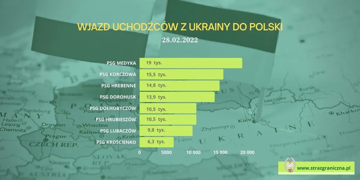 Прикордонна служба Польщі повідомляє, що за 5 днів війни кількість українців, які перетнули польський кордон, склала близько 353 тисяч осіб. Для порівняння за день до нападу, пункти пропуски перетнуло 17 тисяч людей.