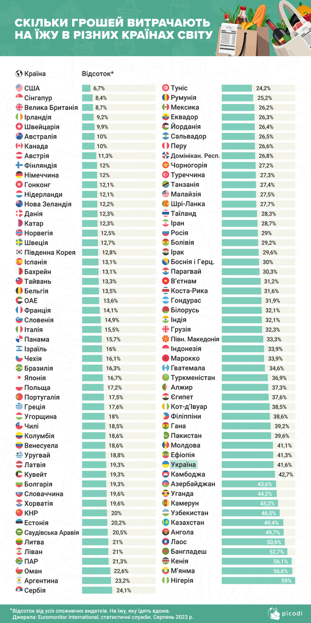 Скільки витрачають на їжу в різних країнах світу / Інфографіка picodi.com