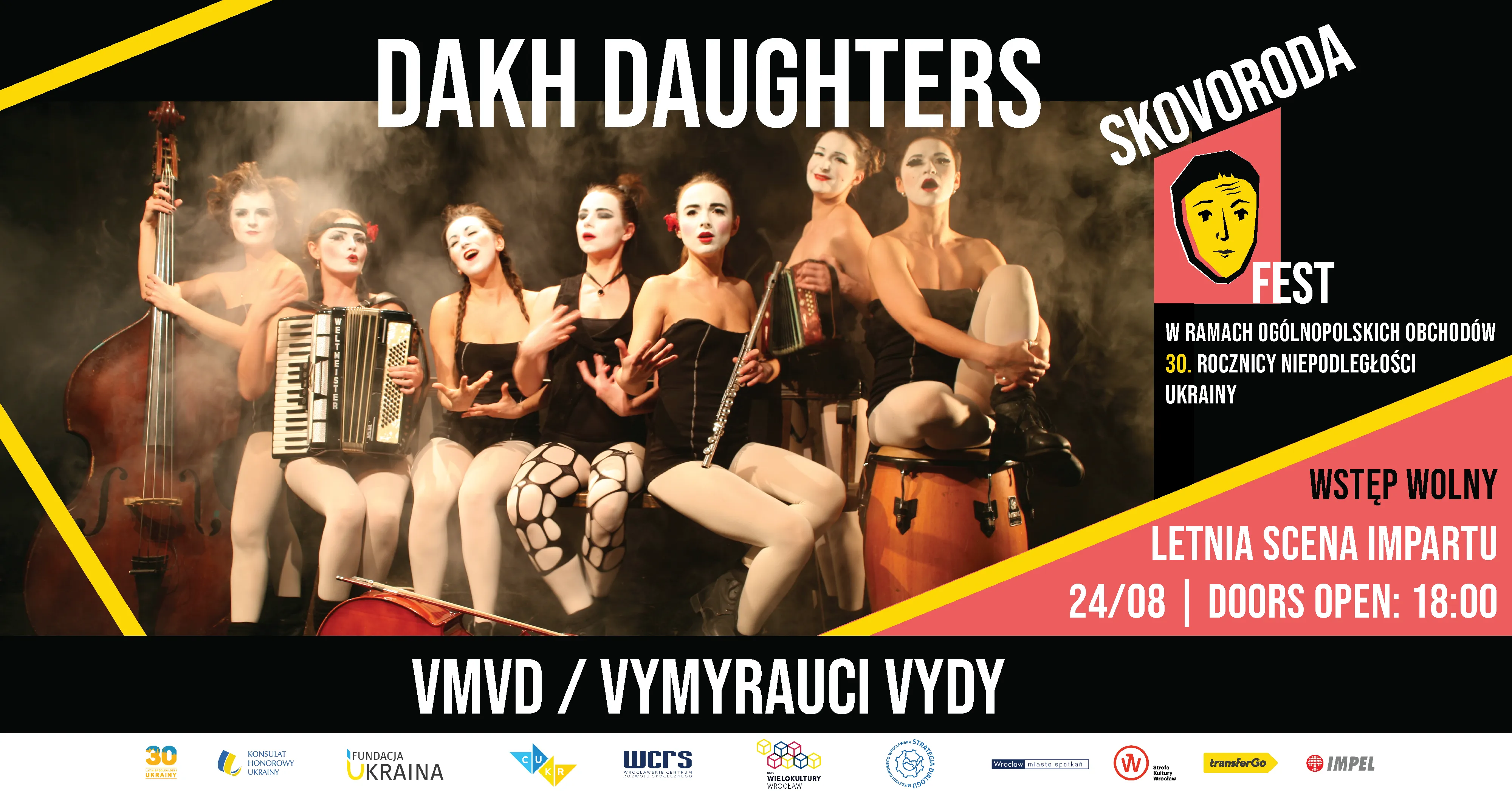 20:30 – 22:00 – виступ музично-театрального гурту "Dakh Daughters". Тут відвідувачі поринуть у насичену суміш різноманітних стилів та жанрів, що поєднує у собі поп, кітч, дарк кабаре та витончене життя з текстами української класики, репу та фольку.