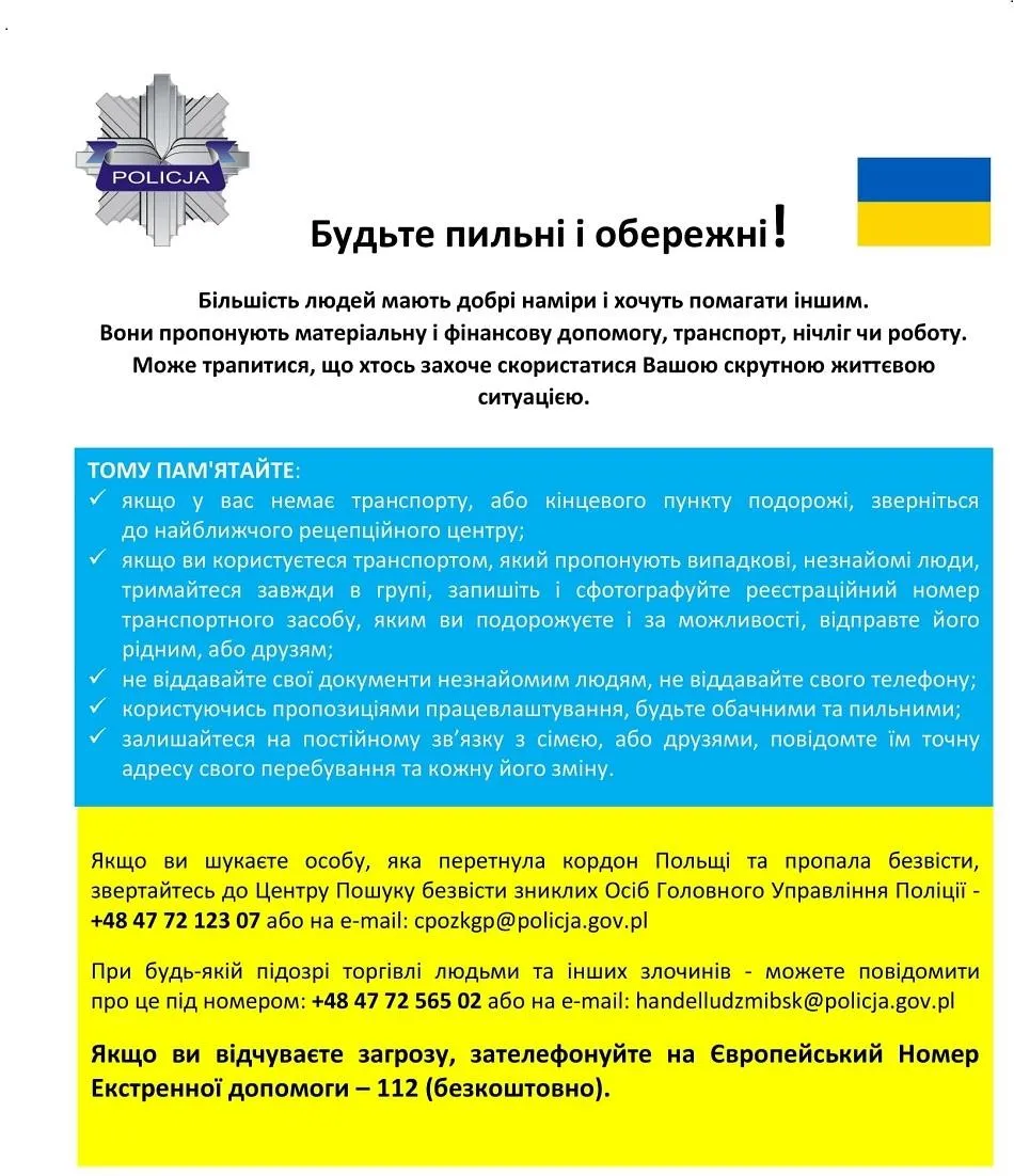 Про випадки підозри у торгівлі людьми та інших злочинах слід повідомити за телефоном +48 47 72 565 02 чи електронною поштою handelludzmibsk@policja.gov.pl.