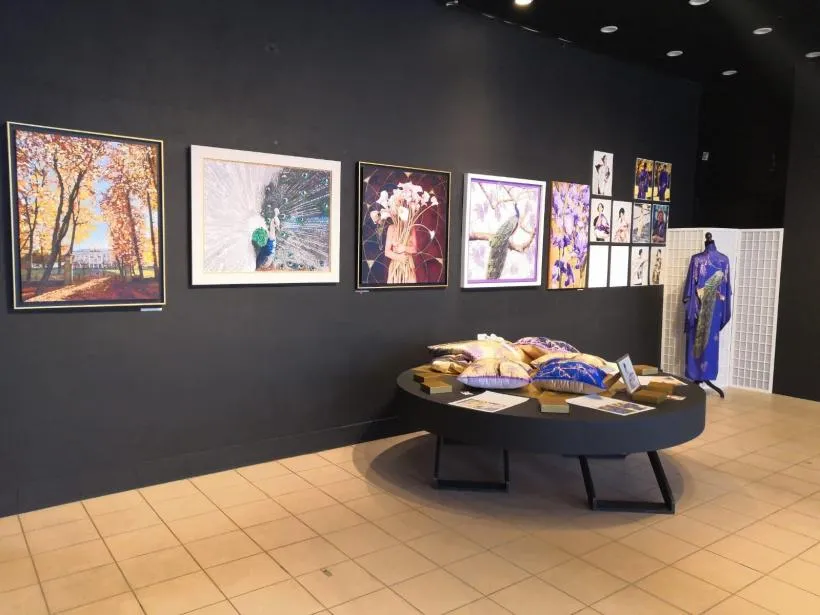 На виставці, крім живопису, також були представлені художні вироби з шовку: сукні в японському стилі та інші речі, малюнки на яких є творчим доробком майстрині Ніни Добровольської.