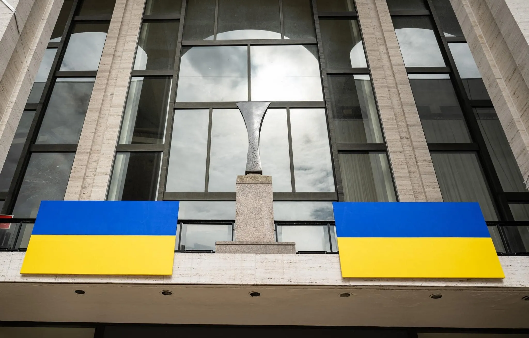 Українські прапори на фасаді Метрополітен-опери в Нью-Йорку протягом наступних чотирьох тижнів в межах міжнародної кампанії подяки Україні за захист демократії для вільного світу,