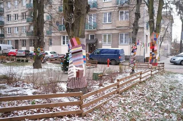Простими словами – це вуличне в'язання. Його вважають видом мистецтва, в якому елементи зовнішнього простору (найчастіше міська архітектура та дерева) покриваються пряжею. Утворені твори називають "в'язане графіті".Один з дворів Варшави прикрасили в'язаними виробами / Фото The Warsaw