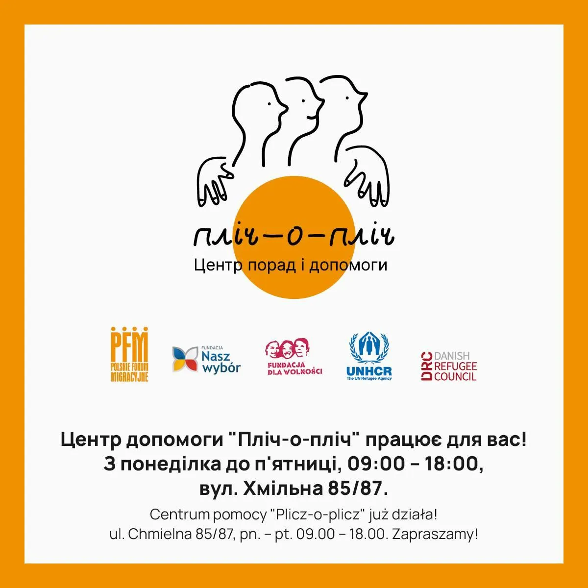 Мовиться про центр "Пліч-о-пліч". Діяльність його спрямована на допомогу громадянам України в польській столиці, які втекли за кордон в пошуках порятунку від війни.