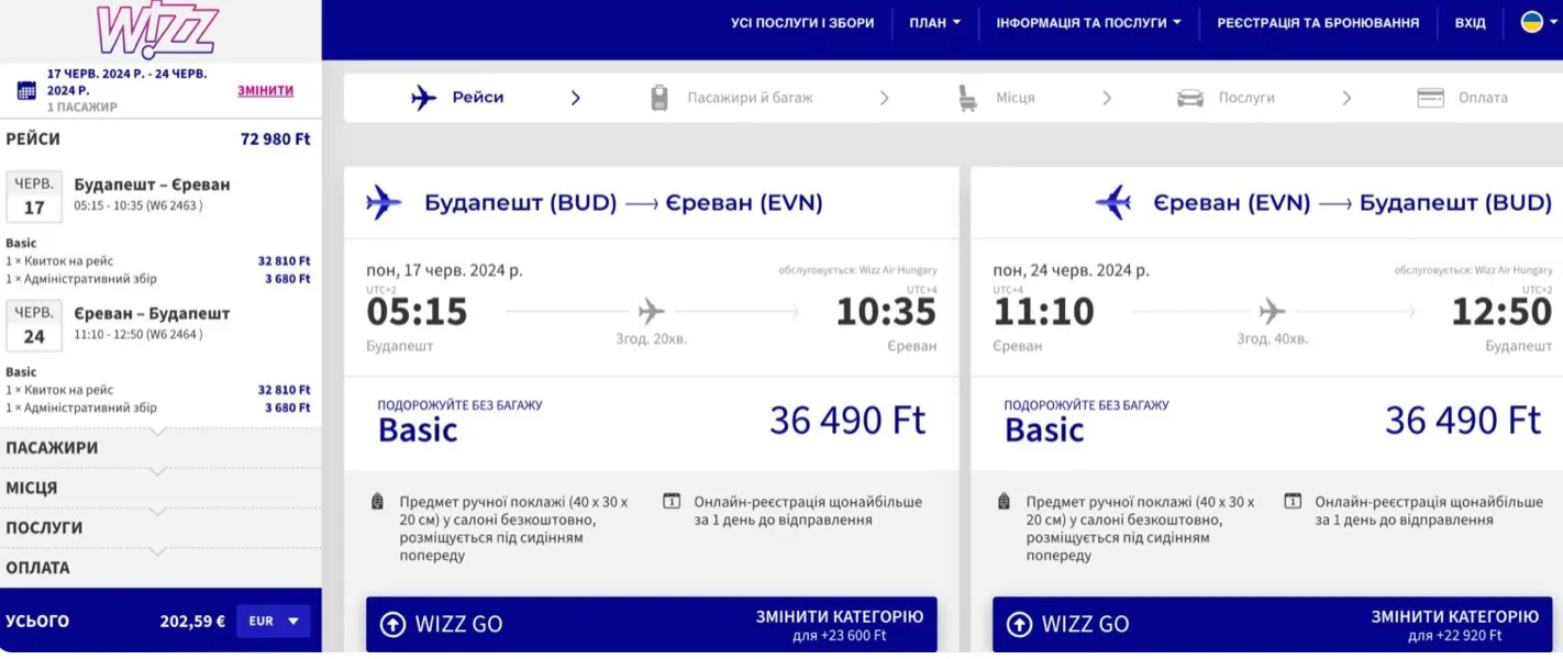 Приклади бронювань авіаквитків Будапешт – Єреван на 17 – 24 червня 2024 року / Скриншот з сайту Wizz Air