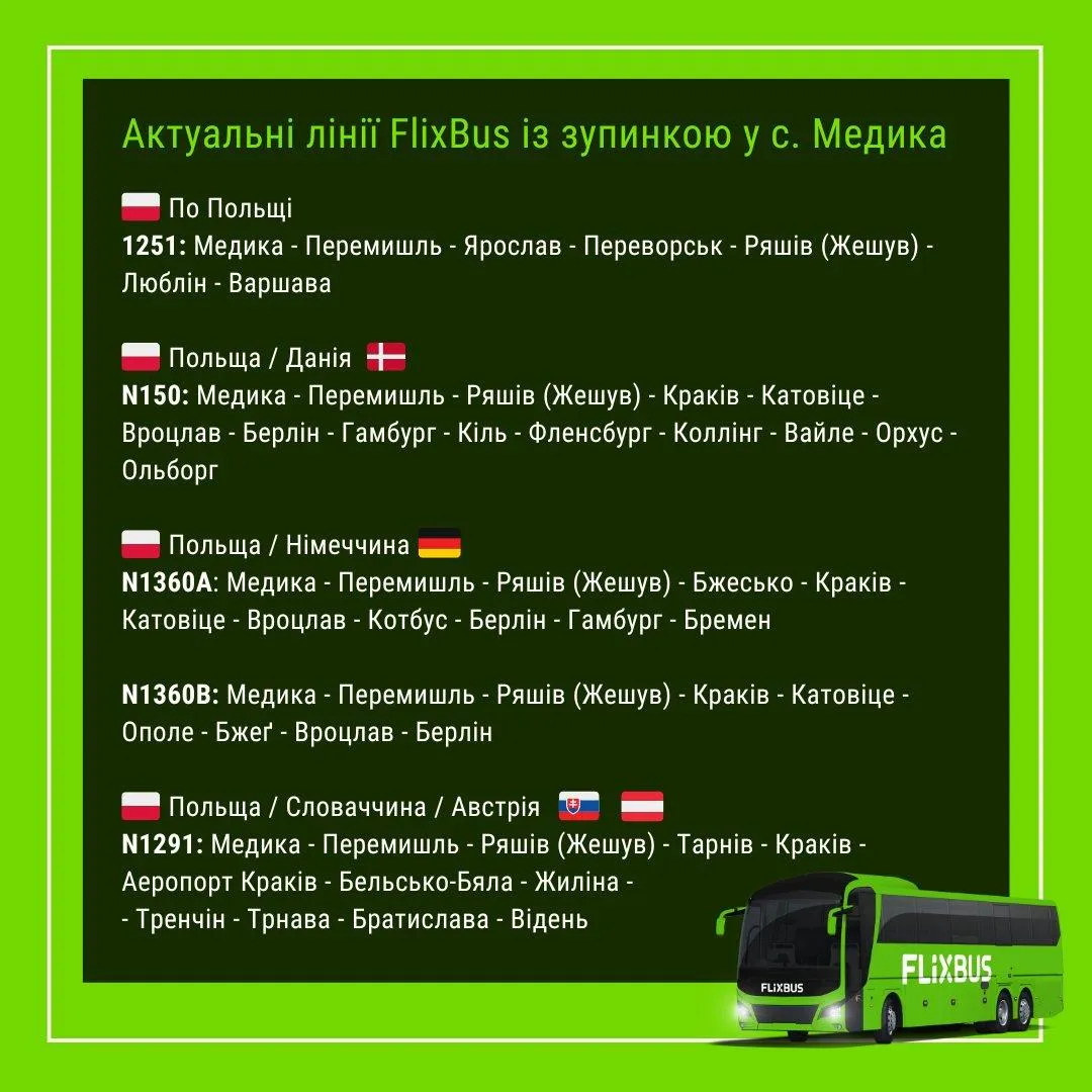 Зокрема йдеться про піший перехід Шегині – Медика. Якщо ви перетнули саме цей пункт пропуску, то на польській стороні є можливість вирушити далі до багатьох міст Польщі та Європи на FlixBus. Автобуси на відновлених маршрутах курсують за такими напрямками: