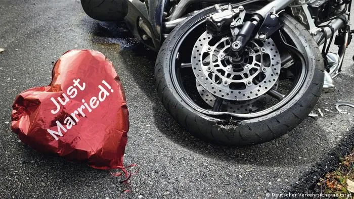 "Збав швидкість!", бо не пізнаєш радощів шлюбу – на цьому мотоциклі молоде подружжя виїхало з РАЦСу, але через жахливе ДТП пізнати сімейне життя закоханим так і не вдалося. Творці банера намагаються переконати молодь, що у житті є куди важливіші речі за кількахвилинний адреналін.