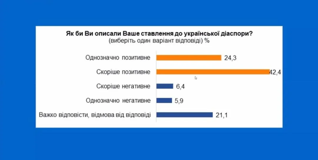 Згідно з результатами опитування 66,7% громадян України мають прихильне ставлення до української діаспори. Так, про однозначно позитивне ставлення заявили 24,4% респондентів, ще 42,4% назвали своє ставлення скоріше позитивним.