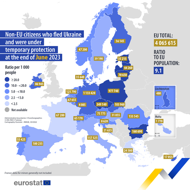 Станом на 30 червня статус тимчасового захисту у країнах ЄС мали 4 мільйони 70 тисяч українських біженців. Найбільше з них знайшли притулок у Німеччині (28%), Польщі (24%) та Чехії (9%).