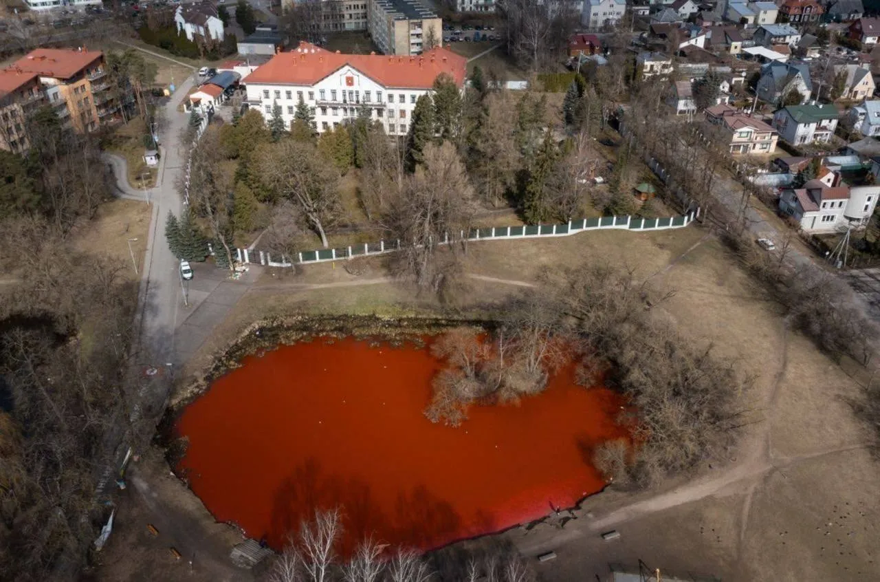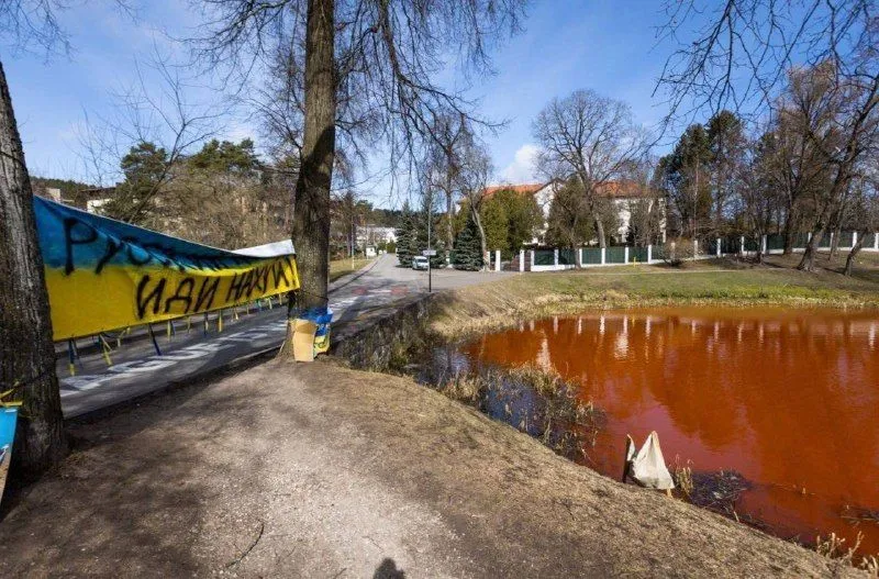 Крім цього, озеро біля посольства Росії у Вільнюсі забарвилося у колір крові. Акція також спрямована проти війни Росії в Україні.